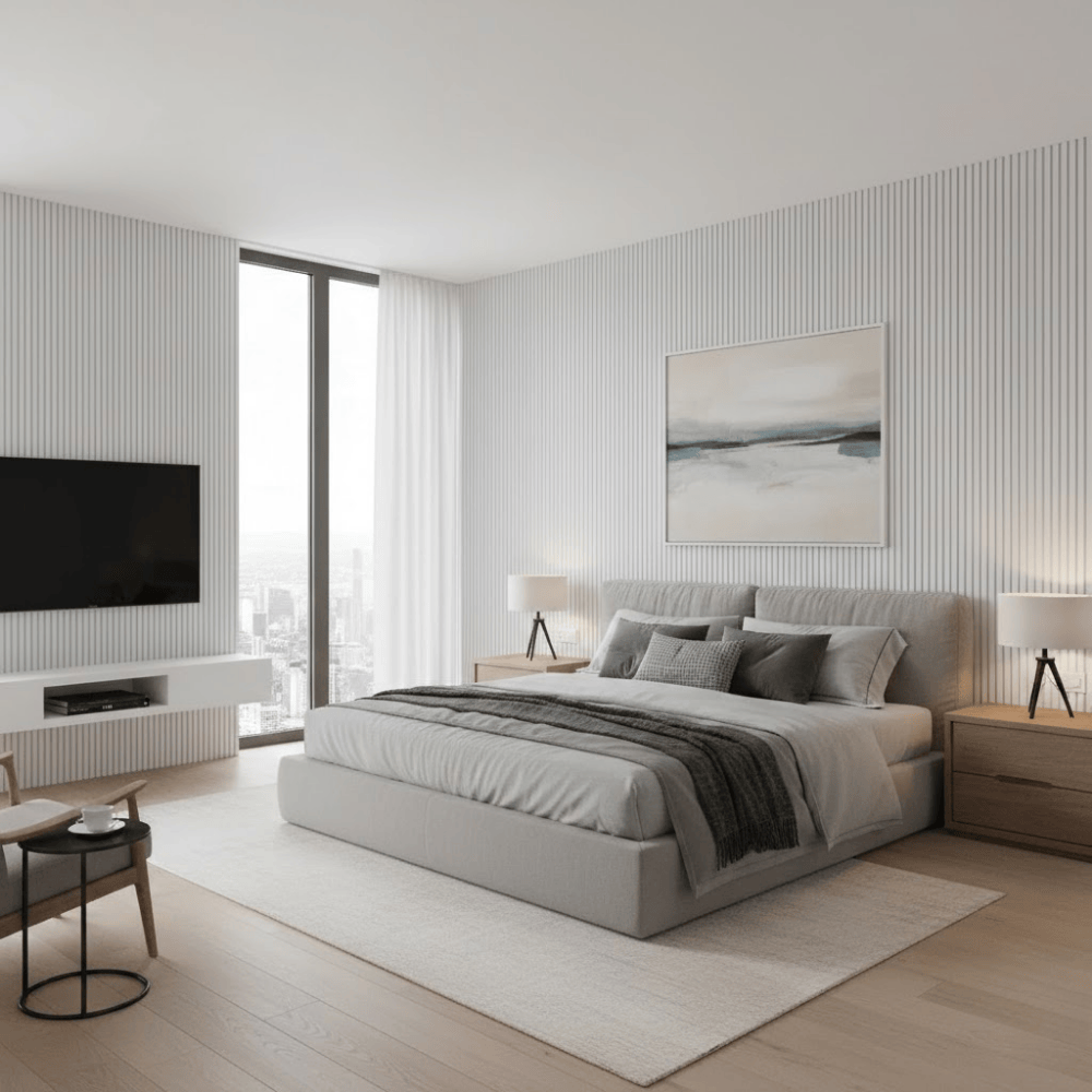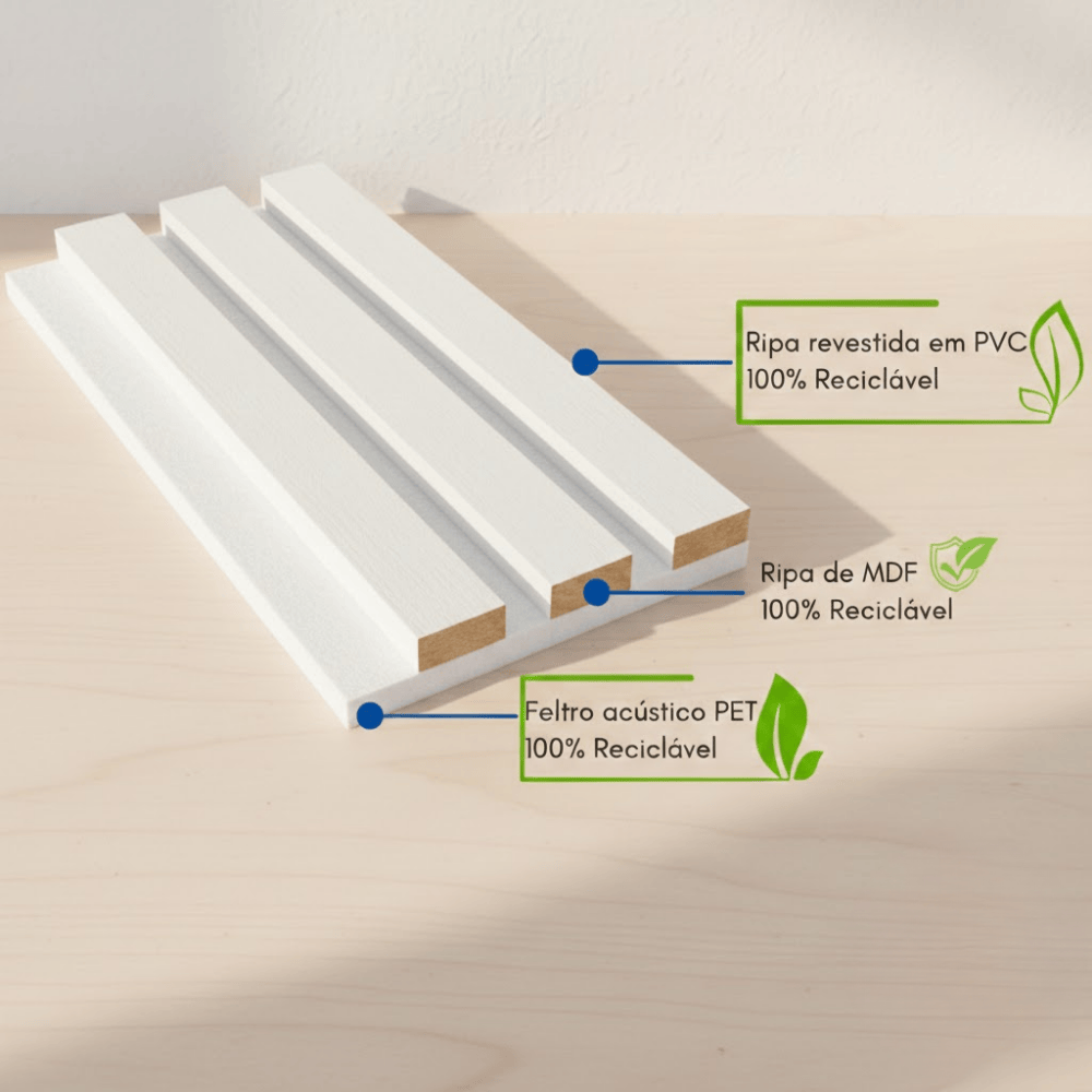 Painel acústico ripado em branco que combina funcionalidade e design moderno. Reduz ruído ambiente enquanto melhora a acústica do espaço, ideal para salas de estar, escritórios e estúdios. O acabamento ripado em branco integra-se perfeitamente em qualquer decoração, oferecendo uma solução elegante e eficaz para controlar reverberação. Fácil de instalar e manter, proporciona conforto acústico duradouro com estética contemporânea.