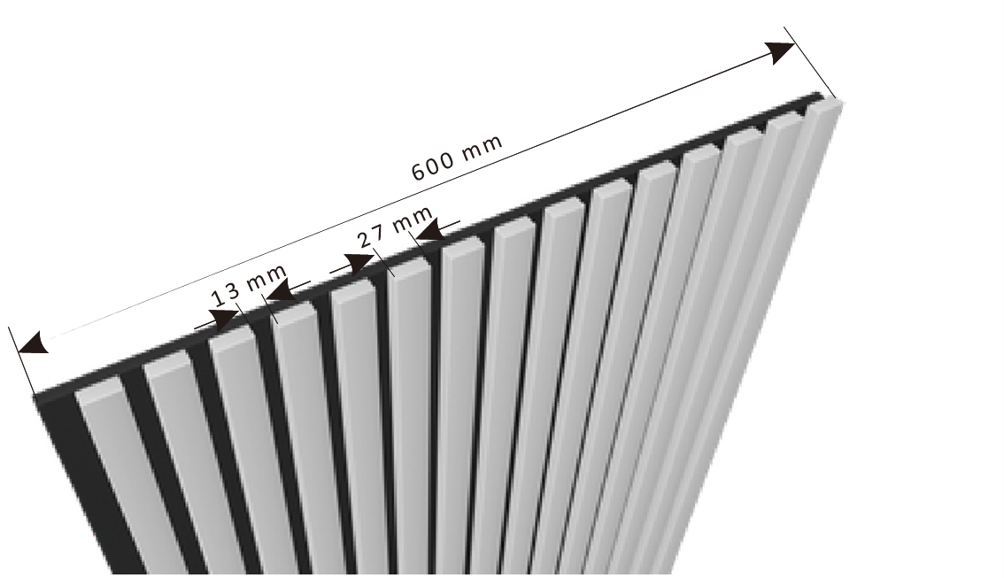 Consiste em um painel acústico de fibra de poliéster PET reciclado preto ou cinza de 9 mm no qual são montadas tiras de 27 mm x 13 mm nas variadas cores e acabamentos MDF reciclado preto folheado a madeira verdadeira. As tiras tem um espaçamento de 14 mm uma da outra.