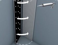 Usando parafusos pretos para a opção de fundo preto ou parafusos prateados ou cinza para o fundo cinza, os painéis podem ser aparafusados diretamente na parede através do feltro acústico.
